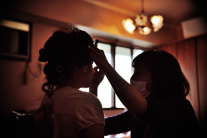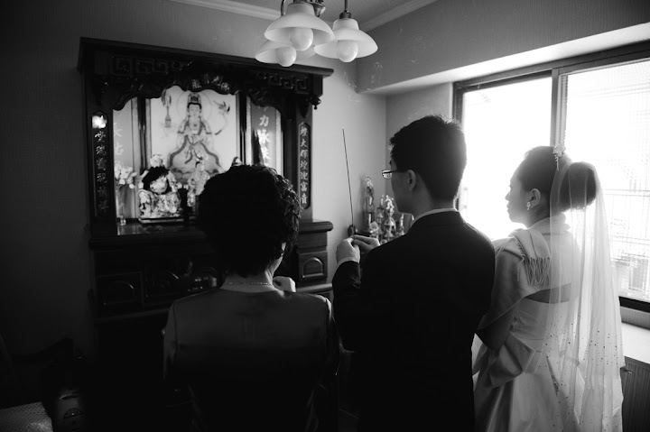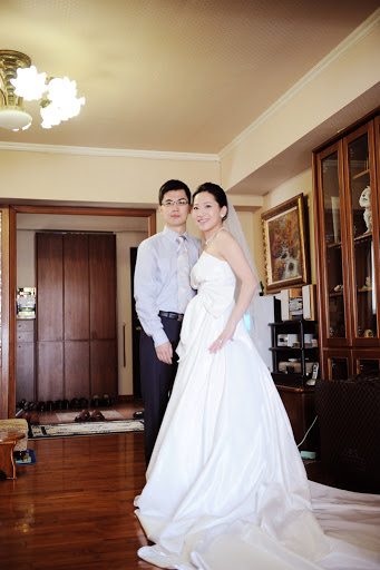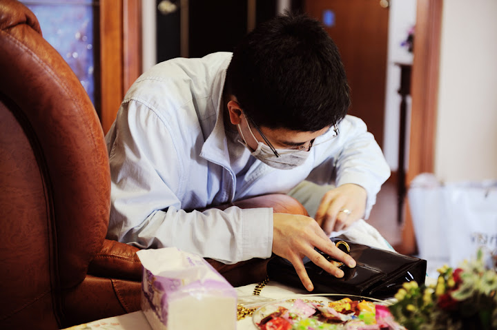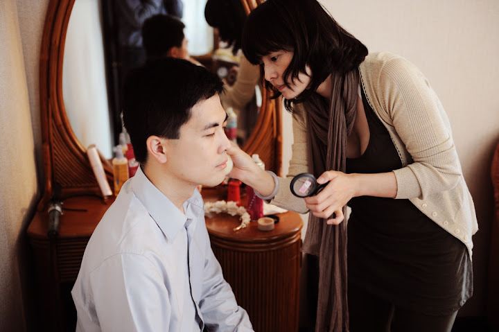 星期日婚宴的當天大家早早就起床準備。我的新秘Sandy也在七點半準時按了電鈴然後過不了多久後婚攝風鈴先生也都到了。以下所有婚禮相關的照片都是這位風鈴先生照的,我想當天除了主人還有媒人招待外,辛苦絕對也有他的份。先簡單提一下這位新秘,當時我的首選並不是她而是台中另外一位Candy,想不到07/11這天是難得的大好日子所以有口碑的新秘都被訂走了所以我就上VeryWed挑了另外一位。跟訂婚那天的靜瑀比起來,如果靜瑀有95分那麼我覺得Sandy大概只有85分左右。從一開始的連繫就讓我跟婆婆三條線,由於Sandy有在授課所以有自己的授課機構所以我們便約在她的工作室溝通造型,只是這位小姐居然給錯地址,給了我們一個隔了好幾條街的住址讓我跟我婆婆二丈摸不著頭腦。其實Sandy的技術還不錯,她上妝的方式很輕柔很像在畫畫所以如果喜歡這樣方式的人會覺得很舒服。只是我覺得她在髮型方面不夠利落,綁個頭髮還有上捲子的方式都讓我覺得她使不太出力氣所以髮型總是有點零落的感覺。